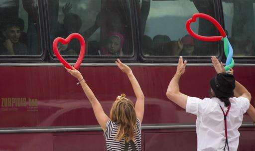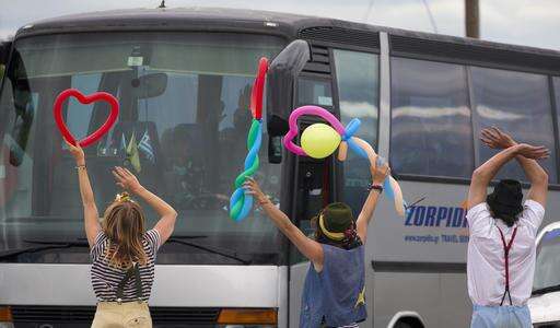 Activists who used to entertain children at a migrants camp, greet migrants who are transferred elsewhere, near Idomeni, Greece, Wednesday, May 25, 2016. Refugees and other migrants were boarding buses heading to organized camps Monday on the second day of an operation to evacuate the sprawling Idomeni refugee camp on the Greek-Macedonian border. (AP Photo/Darko Bandic) The Associated Press