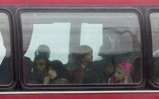 Migrants ride on a bus to be transferred elsewhere, near an informal camp in Idomeni, Greece, Wednesday, May 25, 2016. Refugees and other migrants were boarding buses heading to organized camps Monday on the second day of an operation to evacuate the sprawling Idomeni refugee camp on the Greek-Macedonian border. (AP Photo/Darko Bandic) The Associated Press