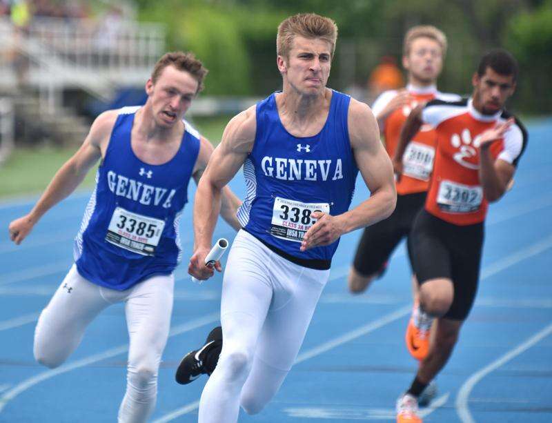 Geneva's Sean Chambers gives the baton to Donny Friedel in the 4x200 meter relay Friday at the boys track state finals prelim events in O'Brien Stadium at Eastern Illinois University in Charleston.