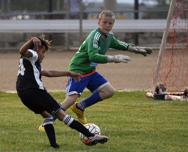 Lions SC U10 player Alexis Sanchez, attacking midfielder, goes up against the goalie of the Chicago CSA Barcelona at the Grove United Memorial Day Shootout soccer tournament Friday in Schaumburg. Mark Welsh/mwelsh@dailyherald.com