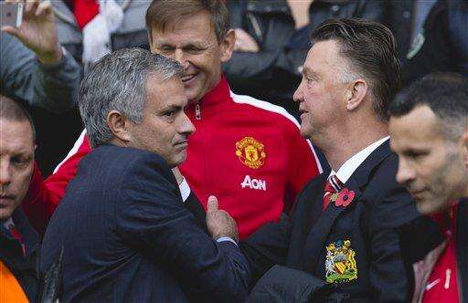 FILE- In this Sunday Oct. 26, 2014, file photo, the then Chelsea's manager Jose Mourinho, left, greets Manchester United manager Louis van Gaal, before the English Premier League soccer match between Manchester United and Chelsea at Old Trafford Stadium, Manchester, England. Manchester United hired Jose Mourinho as its third manager in three years on Friday, entrusting the highly successful Portuguese coach with the job of restoring the status of England's most prestigious club. (AP Photo/Jon Super, File) The Associated Press