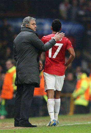FILE- In this Tuesday, March 5, 2013 file photo, the then Real Madrid's coach Jose Mourinho pats Manchester United's Nani on the back as he leaves the field after being shown a red card during the Champions League round of 16 soccer match at Old Trafford Stadium, Manchester, England. Manchester United announced on Friday May 27, 2016, they hired Jose Mourinho as its third manager in three years on Friday, entrusting the highly successful Portuguese coach with the job of restoring the status of England's most prestigious club. (AP Photo/Jon Super, File) The Associated Press