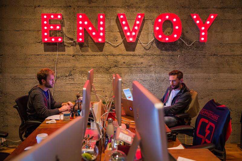 Employees of Envoy can be seen working in their San Francisco office space. The 30-person company enables businesses to register visitors using iPads instead of handwritten visitor logs. Nick Otto for The Washington Post.