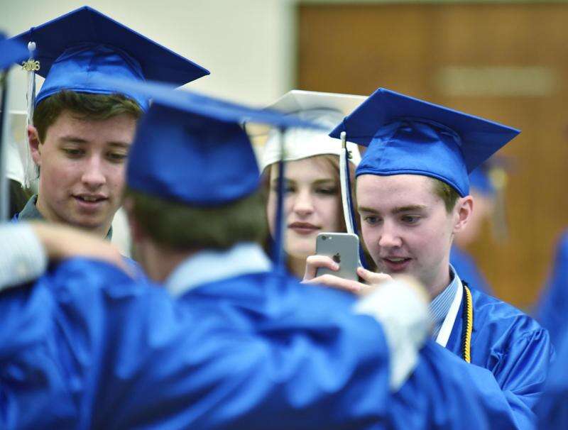 Graduate Natalia Avalos laughs as more than one person helps her primp before Lake Zurich High School graduation Sunday at the school.