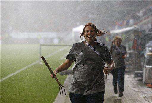 Play resumed almost 40 minutes later on the water-sodden pitch, but ball control proved difficult for both sides.