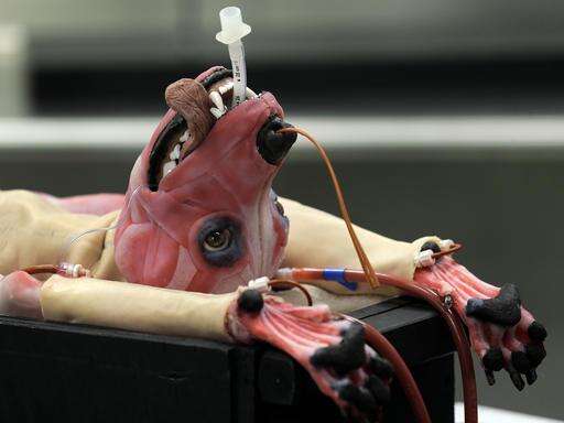 SynDaver's cadavers, both human and canine, are created with functioning bodily systems, complete with a heartbeat, a circulatory system, lungs that inflate and flesh that bleeds when cut. The skin is creepily chilly and the rubbery organs are clammy to the touch.