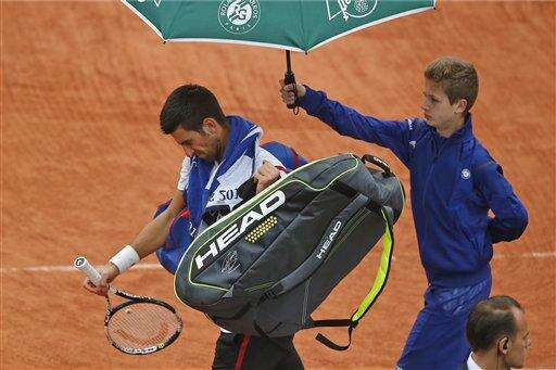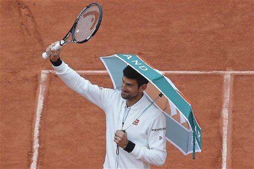 During one break, Djokovic, seeking to win a fourth consecutive major title and complete a career Grand Slam, wandered around Court Philippe Chatrier to check the weather, borrowing a green-and-orange Roland Garros umbrella from a fan.