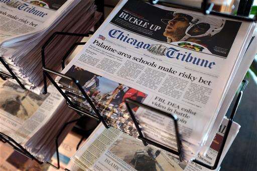 FILE - In this Monday, April 25, 2016, file photo, Chicago Tribune and other newspapers are displayed at Chicago's O'Hare International Airport. Tribune Publishing is fighting to stave off USA Today owner Gannett, though it’s not immediately clear why. Print ad revenues are in the toilet and cost-cutting is the mantra of the day. It may all come down to a clash of bean-counters against visionaries, or maybe Tribune is just holding out for the best possible price. (AP Photo/Kiichiro Sato, File) The Associated Press