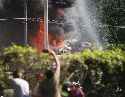 Bystanders watch a fire burns following an explosion in a scrap pile at All Metals Recycling in Madison, Wis., Wednesday, June 1, 2016. (John Hart/Wisconsin State Journal via AP) MANDATORY CREDIT The Associated Press