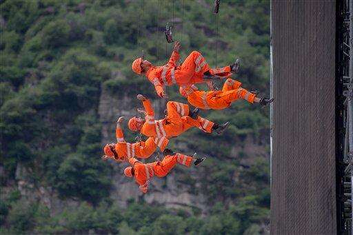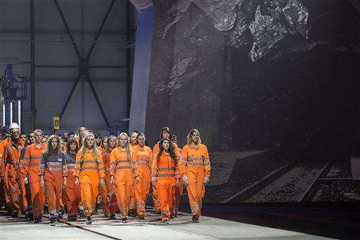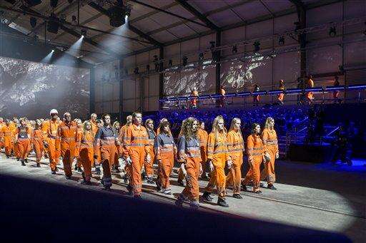 Artists perform during the opening show directed by German director Volker Hesse, on the opening day of the Gotthard rail tunnel, the longest tunnel in the world, at the fairground Rynaecht at the northern portal in Erstfeld, Switzerland, Wednesday, June 1, 2016. The construction of the 57 kilometer long tunnel began in 1999, the breakthrough was in 2010. (Alexandra Wey/Keystone via AP)
