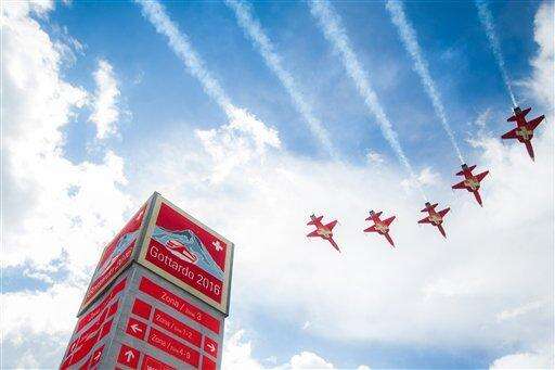 The Patrouille Suisse performs on the opening day of the Gotthard rail tunnel, at the fairground at the southern portal in Pollegio, Switzerland, Wednesday, June 1, 2016. The construction of the 57 kilometer long tunnel began in 1999, the breakthrough was in 2010. (Samuel Golay/Keystone,Ti-Press via AP)