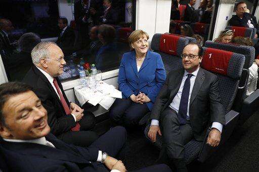 Italian Prime Minister Matteo Renzi, Swiss Federal President Johann Schneider-Ammann, German Chancellor Angela Merkel, and French President Francois Hollande, from left to right, sit in the VIP-train driving through the Gotthard from north to south, on the opening day of the Gotthard rail tunnel, , between Erstfeld and Pollegio, Switzerland, Wednesday, June 1, 2016. The construction of the 57 kilometer long tunnel began in 1999, the breakthrough was in 2010. After the official opening on June 1, the commercial operation will start in December 2016. (Peter Klaunzer/ Pool Photo via AP)