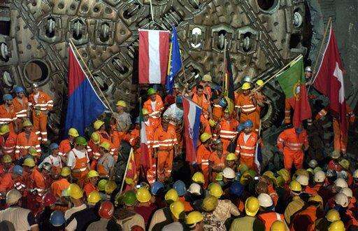 - FILE - In this June 16, 2009 file photo minors watch the tunnel drilling machine "Gabi" breaking through the last section of the AlpTransit "New Railway Link through the Alps" (NRLA) tunnel between Erstfeld and Amsteg, Switzerland. The celebrations of the opening of the Gotthard Base Tunnel will start on June 1, 2016. With a length of 57 km (35 miles) crossing the Alps, the Gotthard Base tunnel is world's longest train tunnel. (Sigi Tischler/Keystone via AP, file)
