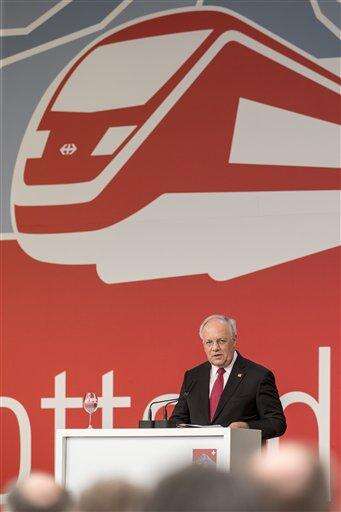 Swiss Federal President Johann Schneider-Ammann delivers a speech on the opening day of the Gotthard rail tunnel, the longest tunnel in the world, at the southern portal in Pollegio, Switzerland, Wednesday, June 1, 2016. The construction of the 57 kilometer long tunnel began in 1999, the breakthrough was in 2010. (Alexandra Wey/Keystone via AP)