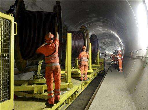 FILE - In this Oct. 31, 2013 file photo construction workers are busy in the NEAT Gotthard Base Tunnel between Biasca and Amsteg, Switzerland. The celebrations of the opening of the Gotthard Base Tunnel will start on June 1, 2016. With a length of 57 km (35 miles) crossing the Alps, the Gotthard Base tunnel is world's longest train tunnel.. (Karl Mathis/Keystone via AP, file)