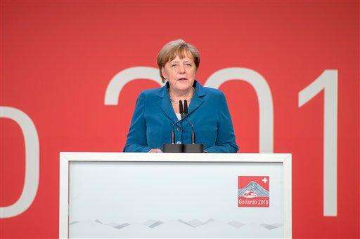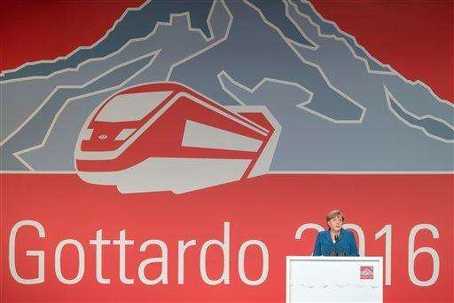 German Chancellor Angela Merkel delivers a speech on the opening day of the Gotthard rail tunnel, t at the fairground in Pollegio, Switzerland, Wednesday, June 1, 2016. The construction of the 57 kilometer long tunnel began in 1999, the breakthrough was in 2010. (Pablo Gianinazzi/Keystone,Ti-Press via AP)