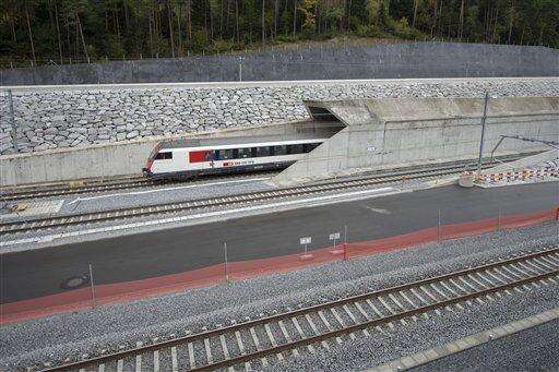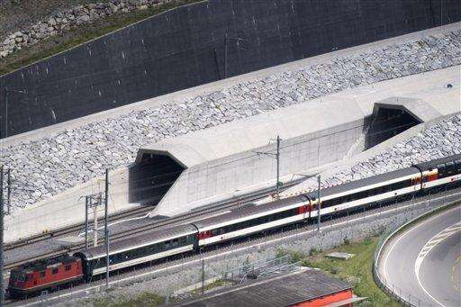 FILE- In this Tuesday, May 31, 2016 file photo, a train passes in front of the northern portal of the Gotthard Base Tunnel on the eve of its inauguration, in Erstfeld, Canton of Uri, Switzerland. Just like Hannibal in ancient times, Swiss engineers have conquered the Alps burrowing the worldâs longest railway tunnel to ease trade and congestion in European trade and travel. (Laurent Gillieron/Keystone via AP)
