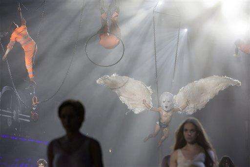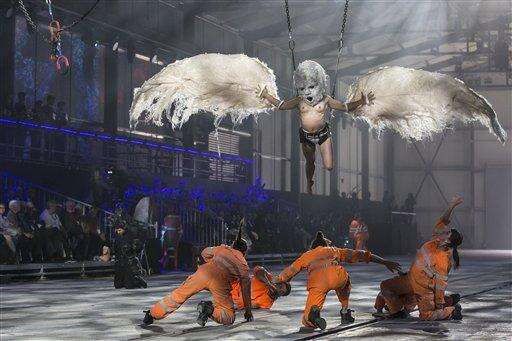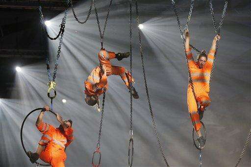 Under purple neon lights, performers dressed in orange miners' suits and protective helmets danced atop a moving rail car, while others in skimpy outfits feigned wrestling and trapeze artists hung from chains or ropes.