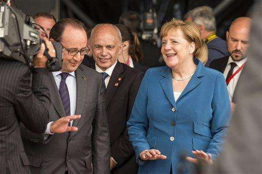 French President Francois Hollande, Swiss federal Councillor Ueli Maurer and German Chancellor Angela Merkel, from left, are pictured on the opening day of the Gotthard rail tunnel, at the southern portal in Pollegio, Switzerland, Wednesday, June 1, 2016. The construction of the 57 kilometer long tunnel began in 1999, the breakthrough was in 2010. (Alexandra Wey/Keystone via AP)