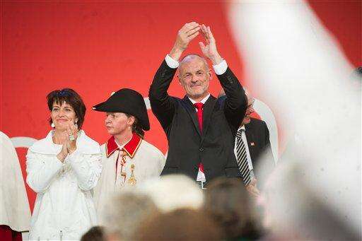French President Francois Hollande delivers a speech on the opening day of the Gotthard rail tunnel, at the fairground in Pollegio, Switzerland, Wednesday, June 1, 2016. The construction of the 57 kilometer long tunnel began in 1999, the breakthrough was in 2010. (Pablo Gianinazzi/Keystone,Ti-Press via AP))