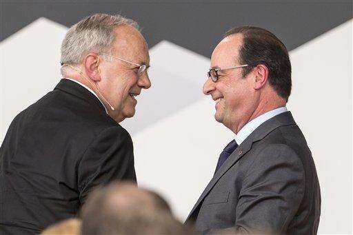 Swiss Federal President Johann Schneider-Amman, left, and French President Francois Hollande, talk on the opening day of the Gotthard rail tunnel, tat the southern portal in Pollegio, Switzerland, Wednesday, June 1, 2016. The construction of the 57 kilometer long tunnel began in 1999, the breakthrough was in 2010. (Alexandra Wey/Keystone via AP)