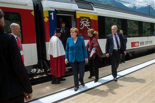 German Chancellor Angela Merkel arrives at the southern portal after she and other officials and special guests drove by train through the Gotthard from north to south, on the opening day of the Gotthard rail tunnel, at the fairground in Pollegio, Switzerland, Wednesday, June 1, 2016. The construction of the 57 kilometer long tunnel began in 1999, the breakthrough was in 2010. (Gabriele Putzu/Keystone,Ti-Press via AP))