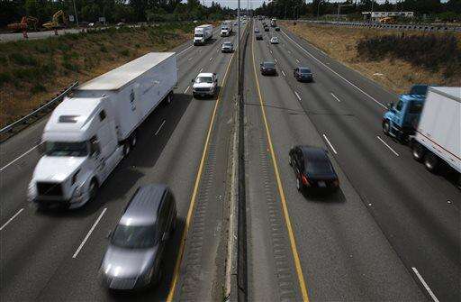 Cars and trucks move along Interstate 5, Wednesday, June 1, 2016, in Lakewood, Wash. Washington state regulators released an updated plan Wednesday to limit greenhouse gas emissions from large polluters. Also on Wednesday, Gov. Jay Inslee joined leaders from Oregon, California and British Columbia in San Francisco to sign a climate agreement that includes encouraging the use of zero-emissions vehicles. (AP Photo/Ted S. Warren) The Associated Press
