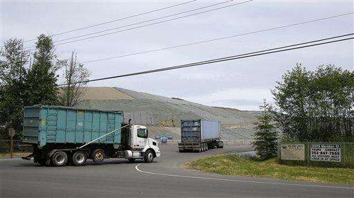 Trucks enter the LRI landfill in Graham, Wash., Wednesday, June 1, 2016. Washington state regulators released an updated plan Wednesday to limit greenhouse gas emissions from large polluters, including the landfill, as the latest attempt by Gov. Jay Inslee to push ahead with a binding cap on carbon emissions after struggling to win approval from legislators. (AP Photo/Ted S. Warren) The Associated Press