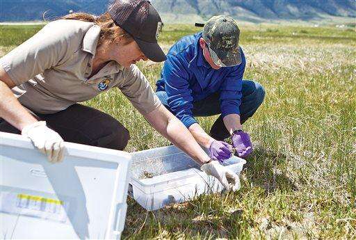 Heidi Meador with the Saratoga National Fish Hatchery and Doug Keinath with the U.S. Fish and Wildlife Environmental Service Office release adult Wyoming toads Wednesday, June 1, 2016, in a wetland at the Buford Foundation Ranch, near Laramie, Wyo. Wildlife officials are releasing more than 900 toads in Wyoming, saying they could help researchers find ways for the endangered species and other amphibians to resist a devastating fungus. (Jeremy Martin/Laramie Daily Boomerang via AP) MANDATORY CREDIT