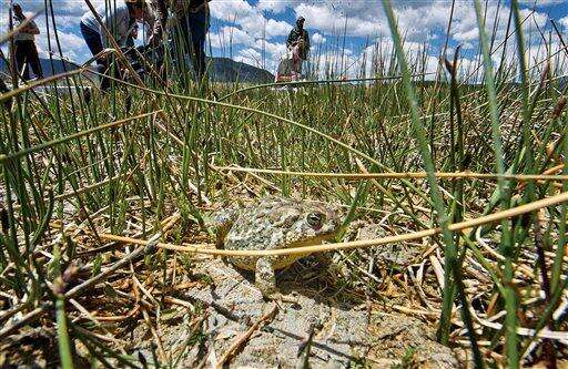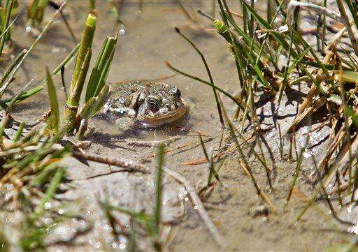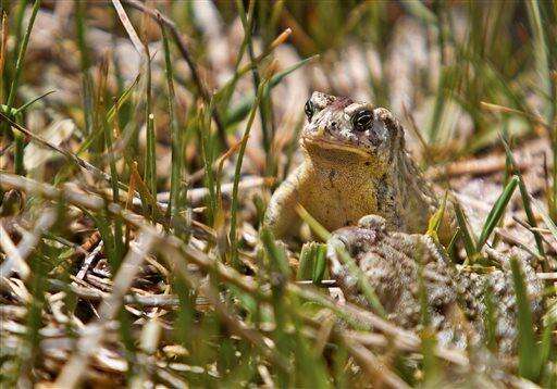 An adult Wyoming sits at a wetland area Wednesday, June 1, 2016, after being released at the Buford Foundation Ranch as part of the U.S. Fish and Wildlife and Saratoga National Fish Hatchery's Cooperative Recovery Initiative project, near Laramie, Wyo. Wildlife officials are releasing more than 900 toads in Wyoming, saying they could help researchers find ways for the endangered species and other amphibians to resist a devastating fungus. (Jeremy Martin/Laramie Daily Boomerang via AP) MANDATORY CREDIT