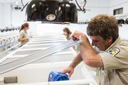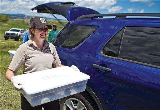 Ana Bode with the Leadville National Fish Hatchery and Lizzy Mack with U.S. Fish and Willife Service load bins of Wyoming Toads into the back of a vehicle Wednesday, June 1, 2016, to be taken to Fred and Stephanie Lindzey's property to be released, near Laramie, Wyo. The Lindzeys have a safe harbor agreement with U.S. Fish and Wildlife enables them to have endangered Wyoming toads released on their property. Wildlife officials are releasing more than 900 toads in Wyoming, saying they could help researchers find ways for the endangered species and other amphibians to resist a devastating fungus. (Jeremy Martin/Laramie Daily Boomerang via AP) MANDATORY CREDIT