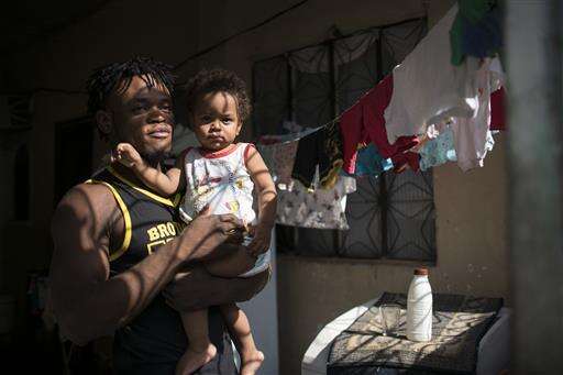 In this May 27, 2016 photo, Popole Misenga, a refugee and judo athlete from the Democratic Republic of Congo who hopes to make the cut for the first Olympic team of refugee athletes, holds his one-year-old son Elias at their home in Rio de Janeiro, Brazil. Misenga fled his war-torn hometowns as a child. Civil strife in the central African nation has caused the deaths of several million people since the mid-1990s. (AP Photo/Felipe Dana)