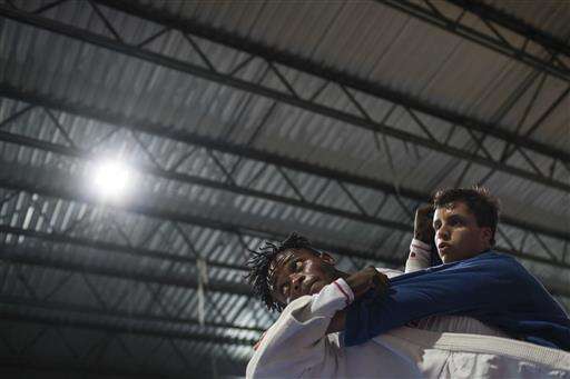 In this May 27, 2016 photo, Popole Misenga, a refugee from the Democratic Republic of Congo, left, practices judo in hopes of making the cut for an Olympic team of refugee athletes, at the Reacao Institute in Rio de Janeiro, Brazil. With the help of the Reacao charity, Misenga has daily judo classes and cross-training just like Brazilian athletes preparing for the Olympics. (AP Photo/Felipe Dana)