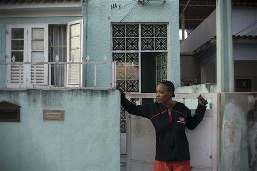 In this May 28, 2016 photo, Yolande Mabika, a refugee and judo athlete from the Democratic Republic of Congo who hopes to join the first Olympic team of refugee athletes, stands at the entrance of her newly rented apartment in Rio de Janeiro, Brazil. A member of Congo's national judo federation, Mabika says that training was harsh and failure to win medals meant punishments, including stints inside a cell with little food or water for days. (AP Photo/Felipe Dana)