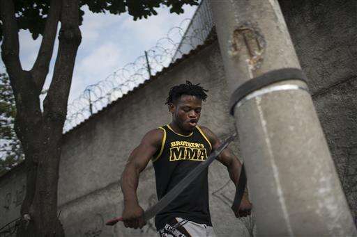 In this May 27, 2016 photo, Popole Misenga, a refugee and judo athlete from the Democratic Republic of Congo, uses a judo black belt attached to a street light pole to trains near his home in Rio de Janeiro, Brazil, in hopes of making the first Olympic refugee team. "For me, this is incredible because a refugee has never participated in the Olympics before," said Misenga, 24. "The whole world will be watching." (AP Photo/Felipe Dana)