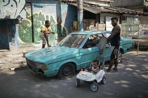 In this May 27, 2016 photo, Popole Misenga, a refugee and judo athlete from the Democratic Republic of Congo who hopes to make the cut for the Olympics first refugee team, talks to a Congolese neighbor as he walks with his one-year-old son Elias in Rio de Janeiro, Brazil. The International Olympic Committee is expected to name members of the Team Refugee Olympic Athletes during its June 1 - 3 meeting. The team will compete under the Olympic flag instead of any one country. (AP Photo/Felipe Dana)