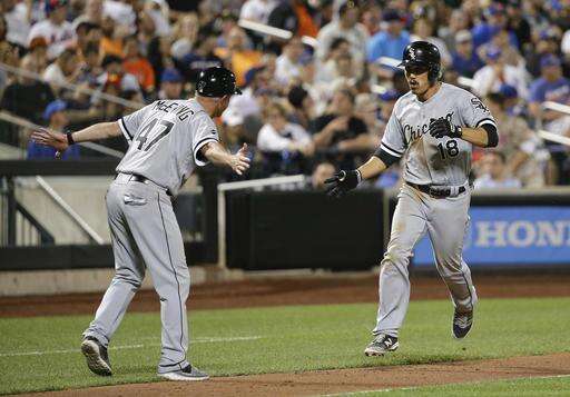 Chicago White Sox's Tyler Saladino (18) is greeted by third base coach Joe McEwing (47) as he rounds the bases after hitting a two-run home run against the New York Mets during the eighth inning of a baseball game, Tuesday, May 31, 2016, in New York. (AP Photo/Julie Jacobson)