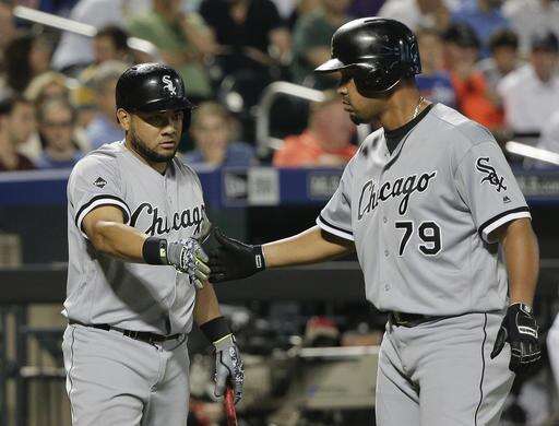Chicago White Sox's Melky Cabrera, left, greets Jose Abreu (79) at the plate after Todd Frazier hit a two-run home run against the New York Mets during the sixth inning of a baseball game, Tuesday, May 31, 2016, in New York. (AP Photo/Julie Jacobson)