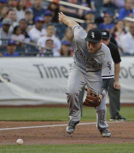 Chicago White Sox third baseman Todd Frazier (21) charges a slow ground ball hit by New York Mets' Wilmer Flores during the second inning of a baseball game, Tuesday, May 31, 2016, in New York. Flores was safe at first on a throwing error by Frazier. (AP Photo/Julie Jacobson)