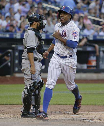 New York Mets' Curtis Granderson reacts after crossing the plate on a sacrifice fly by Yoenis Cespedes during the first inning of a baseball game against the Chicago White Sox, Tuesday, May 31, 2016, in New York. (AP Photo/Julie Jacobson)
