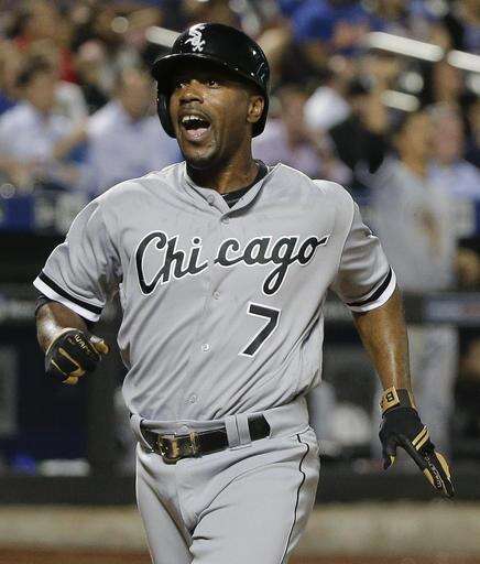 Chicago White Sox's Jimmy Rollins (7) reacts after scoring against the New York Mets on a base hit by Brett Lawrie during the eighth inning of a baseball game, Tuesday, May 31, 2016, in New York. The White Sox won 6-4.(AP Photo/Julie Jacobson)