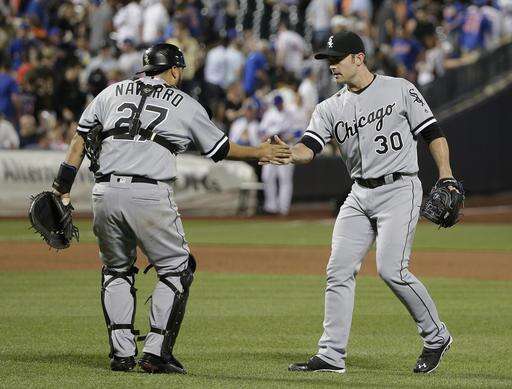 Chicago White Sox catcher Dioner Navarro (27) shakes hands with pitcher David Robertson (30) after the White Sox beat the New York Mets 6-4 in a baseball game, Tuesday, May 31, 2016, in New York. (AP Photo/Julie Jacobson)