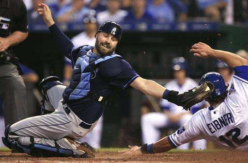 Tampa Bay Rays catcher Curt Casali, left, misses the tag on Kansas City Royals' Brett Eibner (12) during the fourth inning of a baseball game at Kauffman Stadium in Kansas City, Mo., Tuesday, May 31, 2016. Eibner scored on a bunt by Drew Butera. (AP Photo/Orlin Wagner) The Associated Press