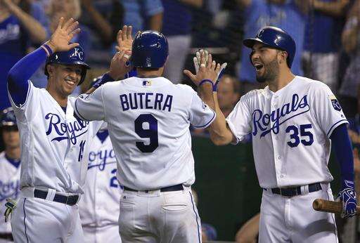 Kansas City Royals' Drew Butera (9) is welcomed home by teammates Cheslor Cuthbert, left, and Eric Hosmer (35) during the fourth inning of a baseball game against the Tampa Bay Rays at Kauffman Stadium in Kansas City, Mo., Tuesday, May 31, 2016. Butera and Cuthbert scored on a single by teammate Lorenzo Cain. (AP Photo/Orlin Wagner) The Associated Press