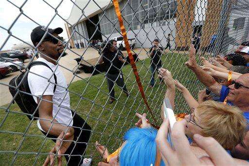 Oklahoma City's Kevin Durant (35) greets fans after the Oklahoma City Thunder arrive home from the NBA Western Conference Finals at Will Rogers Airport in Oklahoma City, Tuesday, May 31, 2016. The Thunder lost to the Golden State Warriors in Game 7 of the series Monday night. (Sarah Phipps/The Oklahoman via AP) LOCAL STATIONS OUT (KFOR, KOCO, KWTV, KOKH, KAUT OUT); LOCAL WEBSITES OUT; LOCAL PRINT OUT (EDMOND SUN OUT, OKLAHOMA GAZETTE OUT) TABLOIDS OUT; MANDATORY CREDIT The Associated Press