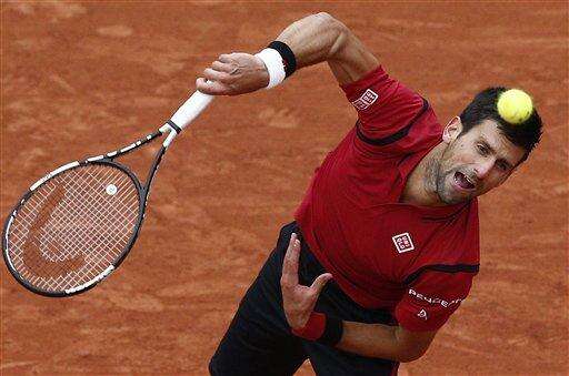 Serbia's Novak Djokovic serves the ball to Austria's Dominic Thiem during their semifinal match of the French Open tennis tournament at the Roland Garros stadium, Friday, June 3, 2016 in Paris. (AP Photo/Christophe Ena) The Associated Press