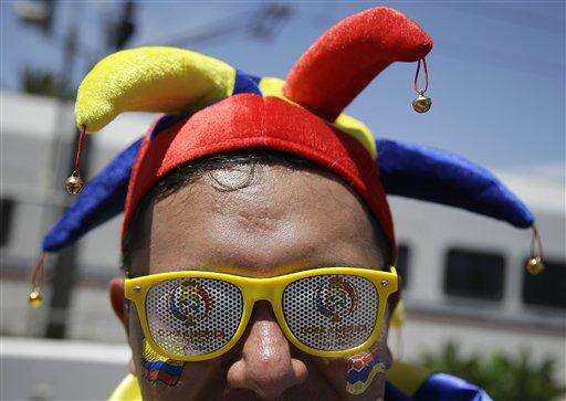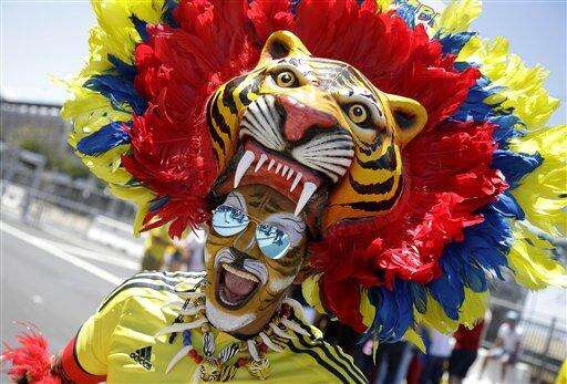 A Colombia fan smiles before a Copa America Centenario Group A soccer match between the United States and Colombia at Levi's Stadium in Santa Clara, Calif., Friday, June 3, 2016. (AP Photo/Marcio Jose Sanchez)