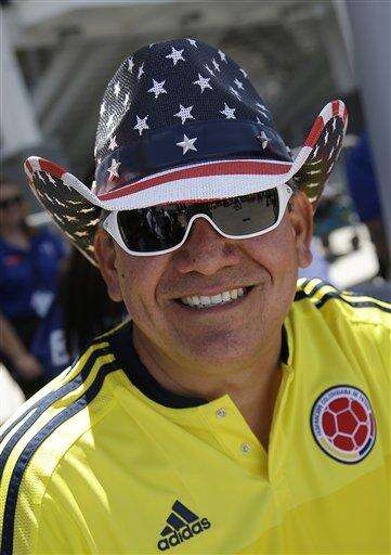 A fan wearing a Colombia soccer jersey and United States hat smiles before a Copa America Centenario Group A soccer match between the United States and Colombia at Levi's Stadium in Santa Clara, Calif., Friday, June 3, 2016. (AP Photo/Marcio Jose Sanchez)