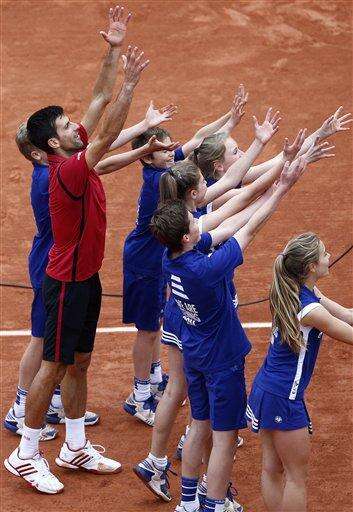 Serbia's Novak Djokovic waves with ball boys after defeating Austria's Dominic Thiem during their semifinal match of the French Open tennis tournament at the Roland Garros stadium, Friday, June 3, 2016 in Paris. (AP Photo/Christophe Ena) The Associated Press