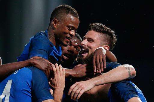 France's Olivier Giroud, right, celebrates after scoring with teammate Paul Pogba, center, and Patrice Evra, left, during the friendly soccer match between France and Scotland at the Saint Symphorien Stadium in Metz, eastern France, Saturday, June 4, 2016. The French squad is in preparation for the EURO 2016 soccer championships which will start on June 10, 2016. (AP Photo/Thibault Camus)